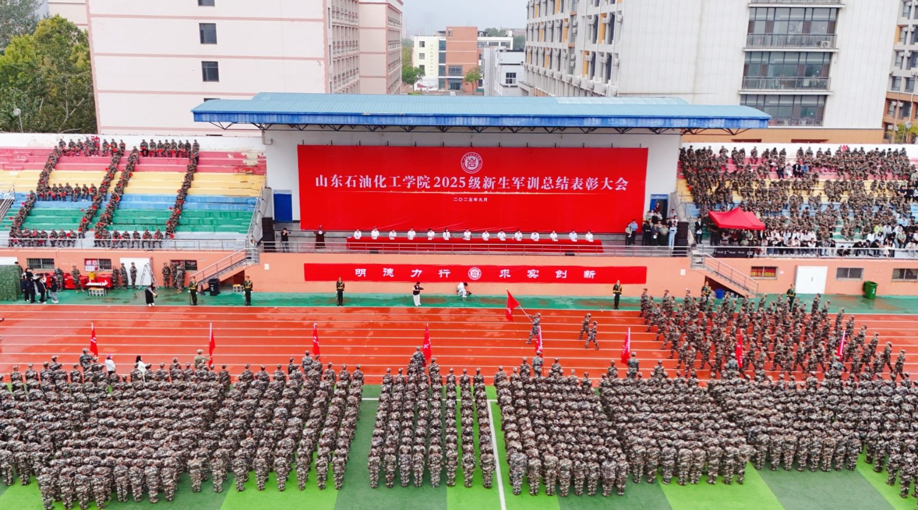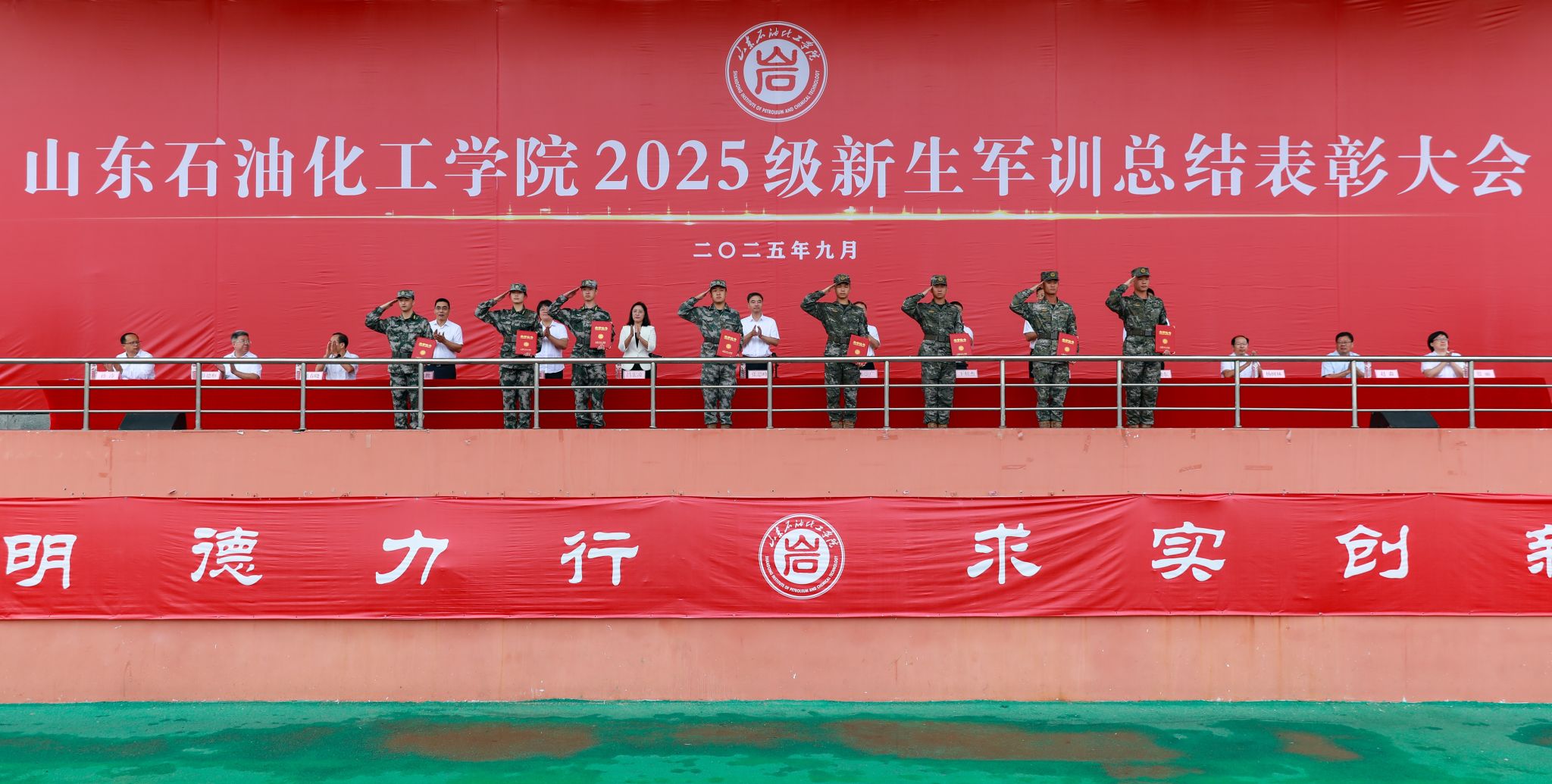秋高气爽,硕果盈枝。9月28日上午,山东石油化工学院2025级新生军训总结表彰大会在学校体育场隆重举行。校党委委员、副校长张思峰出席大会并讲话,校党委委员、纪委书记、监察专员张崇广向承训单位东营海警局颁发锦旗,校党委委员、副校长吕宏凌主持大会。各教学院、职能部门负责人于主席台就座。