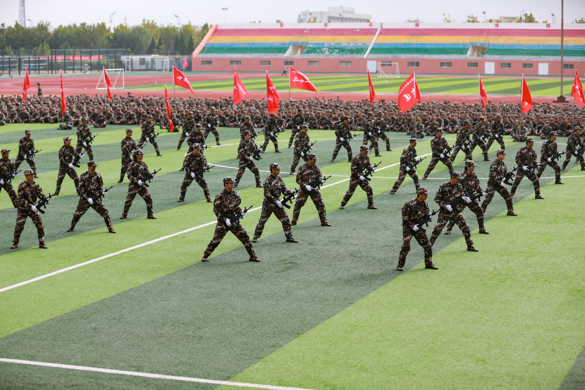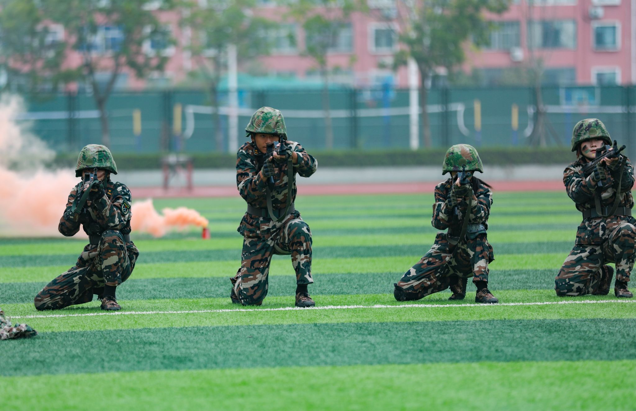 军训成果汇报展示环节中,刺杀操方队动作刚劲有力、气势如虹;擒敌拳方队虎虎生风,招式连贯;战术方队则通过模拟实战场景,展示了新生们灵活应变的能力和扎实的军事技能。同学们巧妙拼出“1945-2025”的字样,高呼“正义必胜、和平必胜、人民必胜”的口号,与抗战胜利80周年阅兵式形成跨越时空的呼应,彰显了军训育人价值与精神传承。