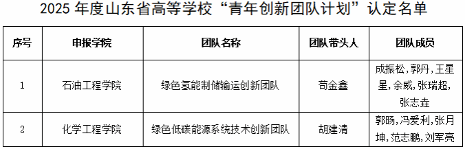 近日,山东省教育厅公布2025年度山东省高等学校“青年创新团队计划”认定名单,我校石油工程学院青年博士教师苟金鑫牵头的“绿色氢能制储输运创新团队”、化学工程学院青年博士教师胡建清牵头的“绿色低碳能源系统技术创新团队”成功入选。
